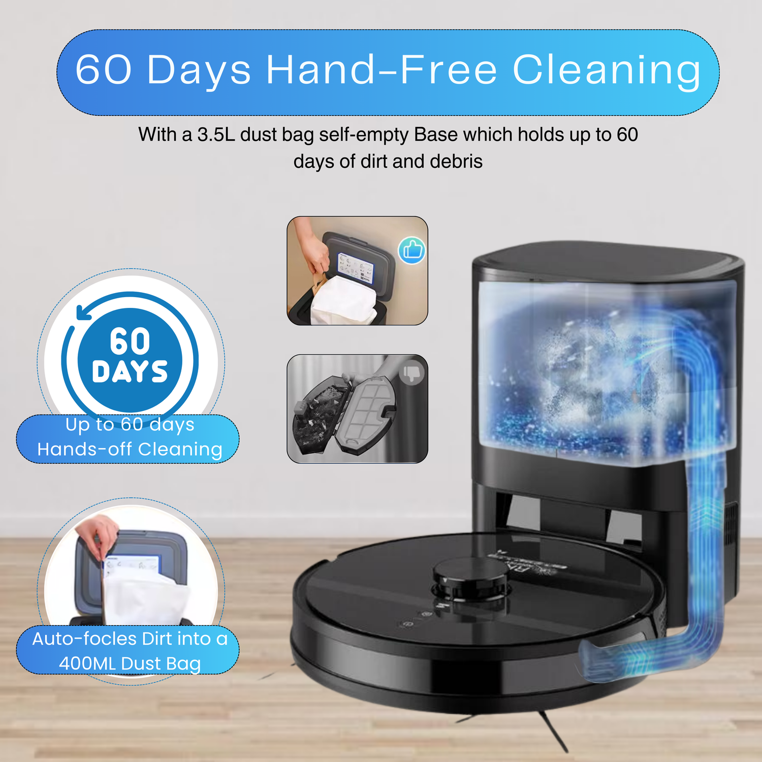Experience the ultimate convenience with the 60 Days Hands-Free Cleaning experience of the 2.0 RKP X6 Robot Vacuum Cleaner. Designed to give you more time and less hassle, this advanced system automatically empties the dustbin into a sealed, extra large bag, holding up to 60 days' worth of dirt and debris. Whether you're tackling pet hair, dust, or daily messes, the 2.0 RKP X6 ensures your floors stay spotless without you lifting a finger. Say goodbye to frequent maintenance and enjoy a cleaner home effortlessly.
