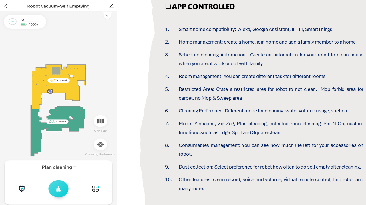 - Real-Time Object Detection Scans and Maps the room, plans, and methodically cleans according to Map.